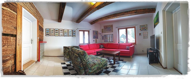- společenská místnost (LED televize, satelitní příjem, DVD přehrávač, tuner, krbová kamna)